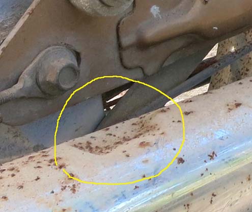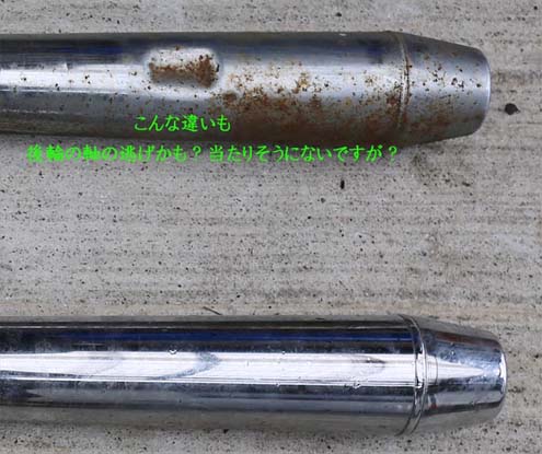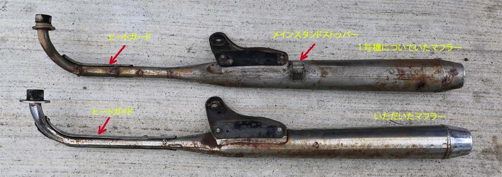 同じように見えるマフラーですが、異なる点がいくつかありました。エンジン近くから、①ヒートガードの長さ、②バッテリー液のオーバーフローパイプクランパー、③メインスタンドのストッパー、④後輪軸の逃げ。