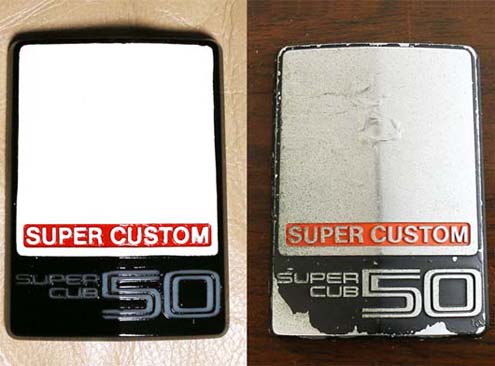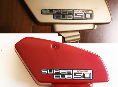 エンブレムはズボンによる摩滅が激しく再生を諦め、オークションで比較的程度の良さそうなサイドカバーを落札し、エンブレムのみ再生して利用した。