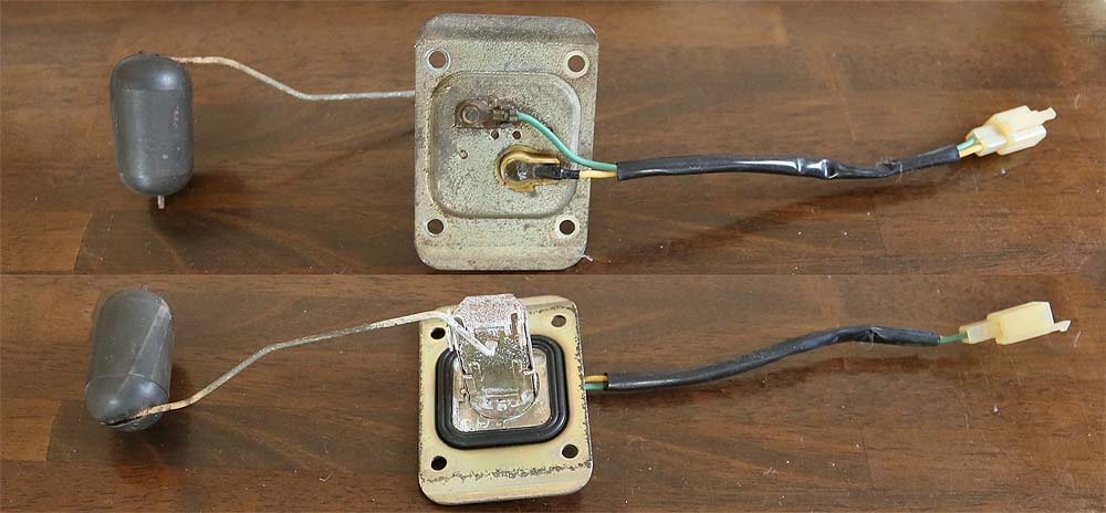 構造は、ニクロム線を抵抗とし、浮きに直結した接触子(ブラシ)がニクロム線抵抗上を油量に応じて移動し、抵抗変化として油量計の針を動かす仕組み。ラジオのボリュームと同じ原理。