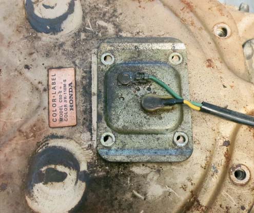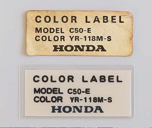 製造年や塗装色を表jしたラベル。「C-50-E」とある。1983年製造の50CCカブ」。