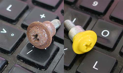 応用編で・・・錆びたボルトもこの方法で塗装し、締め付けは、ボックスレンチとネジの頭の間にビニール袋をガタの無い程度に挟んで締め付ける。 |