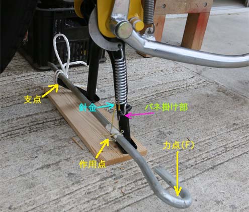 支点をメインスタンドの足かけ部、作用点はバネ、力点は、鉄ペグの頭とし、掛ける荷重は我が体重(60kg)。