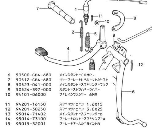 下図の6番(メインスタンド)と12番(割ピン)の間に本体フレームの板が挟まれる。